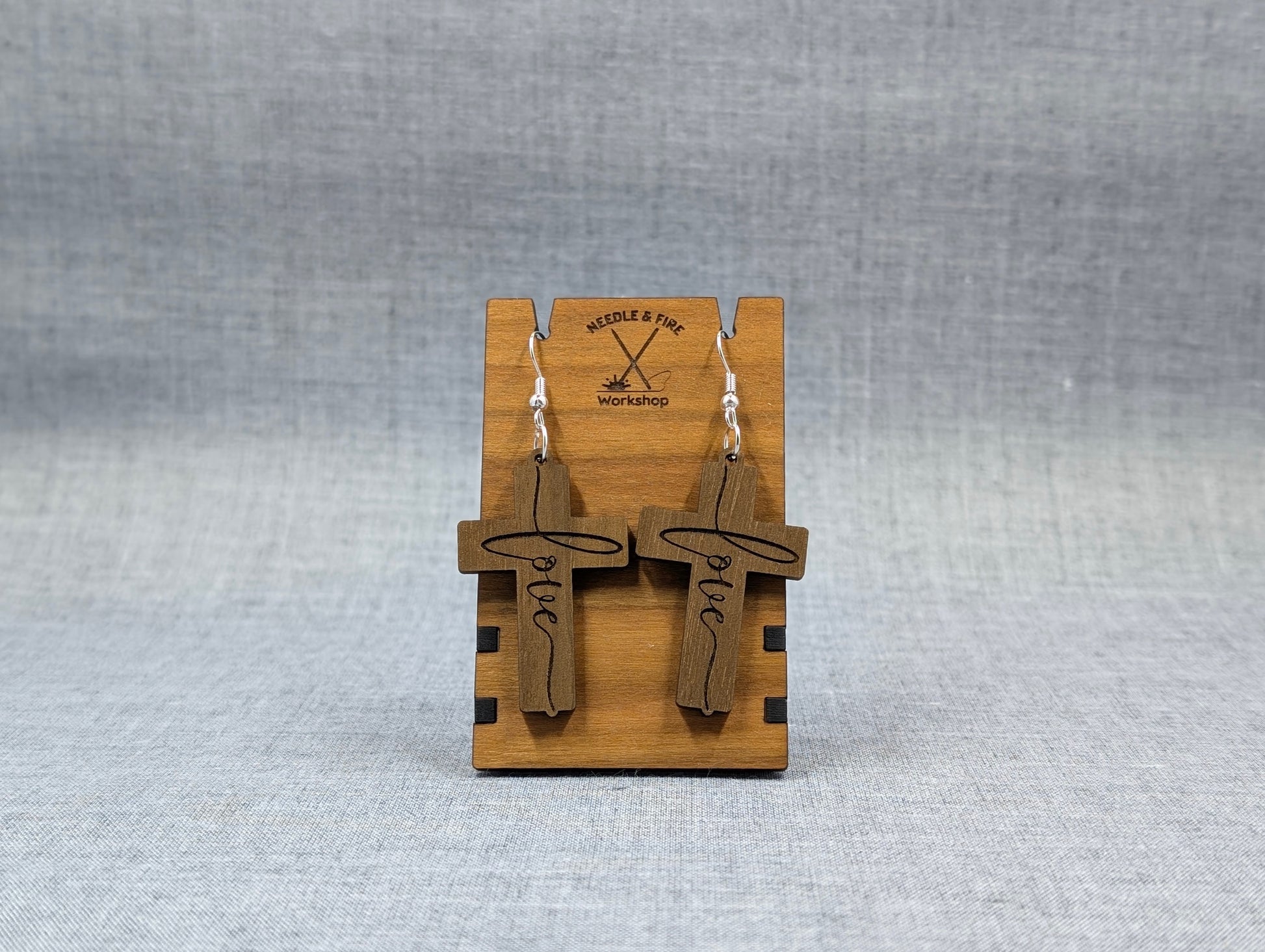 Laser-cut wooden cross earrings engraved with the word “love.” Lightweight and natural wood construction makes them perfect for daily wear, religious gifts, or faith-based accessories. Handmade by Needle & Fire Designs, these spiritual earrings are a meaningful gift for Christian women, churchgoers, or anyone seeking inspirational jewelry.
