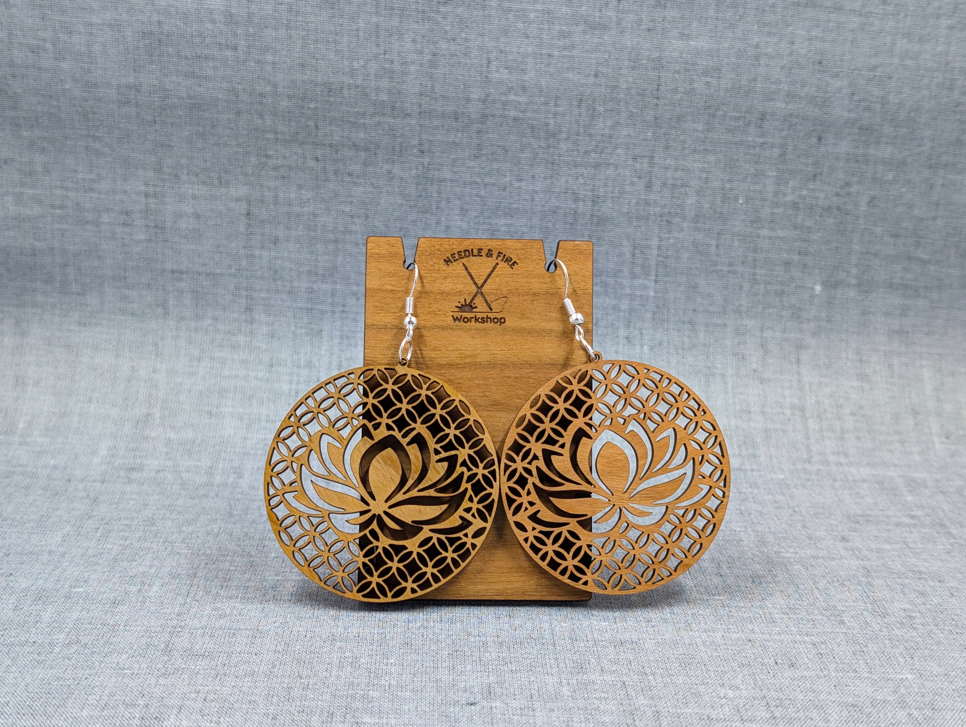 These lightweight wood earrings feature a laser-cut lotus flower design layered over a geometric grid, symbolizing peace, balance, and renewal. The round shape and intricate detail make them a standout piece—perfect for anyone who loves nature, spirituality, or statement earrings with meaning.